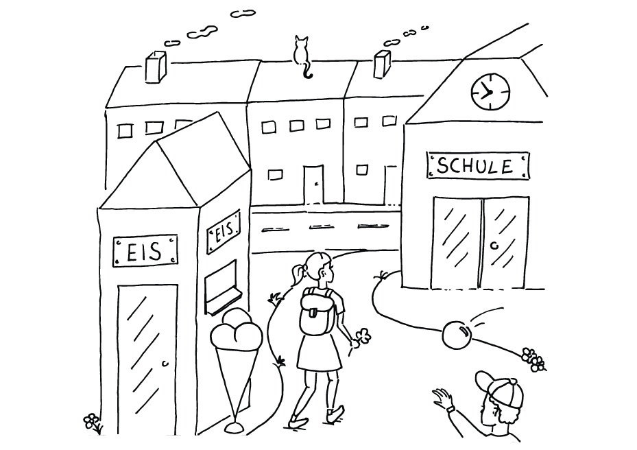 Der kürzeste Weg ist nicht immer der sicherste. Geh lieber dort entlang, wo viele Menschen sind. Geh den Schulweg am besten nur auf dem mit deinen Eltern abgesprochenen Weg, ohne Abkürzungen und merke dir sichere Orte (Notinseln).